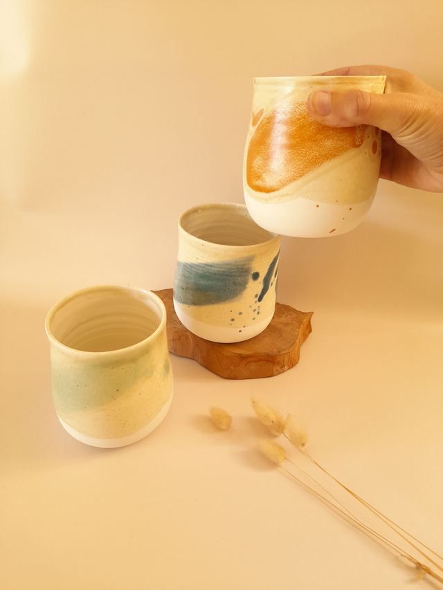 L'émail principal est un émail à base de cendres de Chêne récupérés en cheminée, tamisés puis lavés. Un second émail est superposé au pinceau qui donne des teintes oranges, roses, jaunes ou vertes ou bleues.