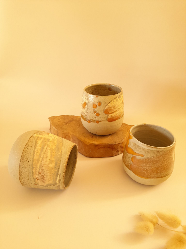L'émail est à base de Cendres de Chêne, puis est appliqué au pinceau un second émail donnant des teintes oranges, jaunes ou roses.